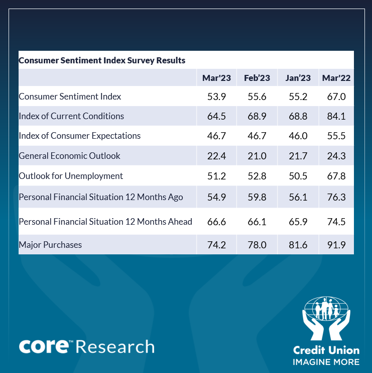 The Credit Union Consumer Sentiment Index (in partnership with Core Research) slipped to 53.9 in March, its weakest reading of the year to date, albeit only modestly lower than the 55.6 reading for February. It was also the first month-on-month drop since last November.