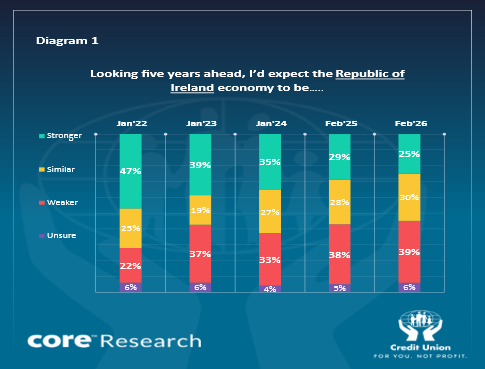 Diagram 1 below compares consumer thinking on the longer-term fortunes of the Irish economy at the start of 2026 with their views through recent years when economic and financial conditions were buffeted by a range of developments.