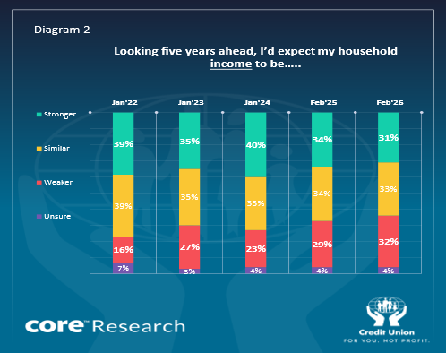 As was the case in previous years, the February 2026 sentiment survey also asked consumers whether they thought their household income would be stronger or weaker than it is at present. The responses are presented in diagram 2 below.