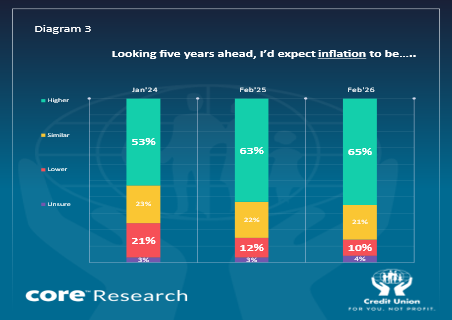 As diagram 3 indicates, two in three Irish consumers (65%) expect inflation to be higher in five years’ time while just one in ten consumers (10%) see it being lower than at present.