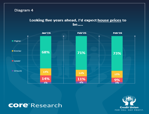 Again, as was the case in each of the past two years, the February reading of the Credit Union Consumer Sentiment Survey (in partnership with Core Research) also asked Irish consumers whether they felt Irish house prices would be higher or lower in five years’ time. Responses to this question are shown in Diagram 4 below.