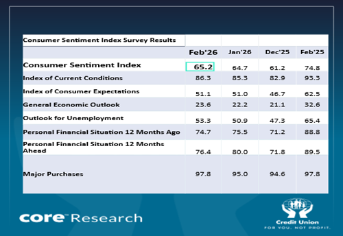 As the table below indicates, the Credit Union Consumer Sentiment Survey (in partnership with Core Research) shows an index reading of 65.2 in February 2026, up slightly on the 64.7 figure recorded in January 2026, but still materially weaker than the February 2025 reading of 74.8.