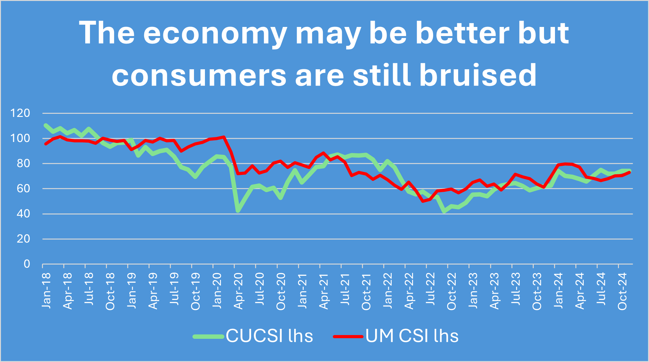 The most positive element of the November sentiment survey was in relation to consumers buying plans. In part, this reflects seasonal spending demands as Christmas approaches. It also likely owes something to a significant ratcheting-up of ‘Black Friday’ advertising promising substantial price discounts. Cost-conscious consumers are probably also aware of a significant easing in Christmas cost inflation as our analysis in section II illustrates. Finally, Government announcements as to exactly when ‘bonus’ welfare payments would be paid could have triggered related spending plans.