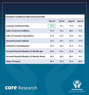 In keeping with the unchanged sentiment reading overall, there were only marginal and offsetting changes in the main elements of The Credit Union Consumer Sentiment Survey (in partnership with Core Research) between October and November.