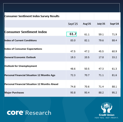 The monthly changes in the main elements of the Credit Union Consumer Sentiment Survey (in partnership with Core Research) were all very modest and largely offsetting in September.