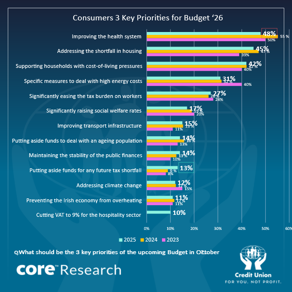 As usual, the Credit Union Consumer Sentiment Survey (in partnership with Core Research) included a couple of supplementary questions on topics of current interest. As was the case in September 2023 and September 2024, this month’s survey asked a representative sample of Irish consumers what they felt should be the priorities of the upcoming Budget ’26 which will be delivered on October 7th.